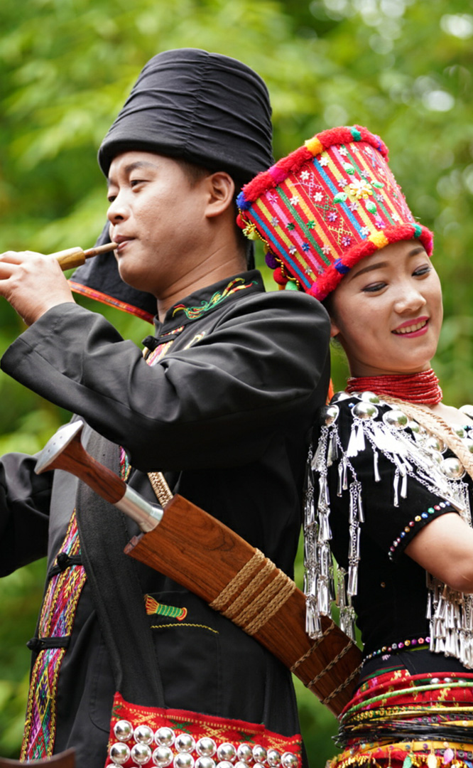拉祜族人口約41萬,主要聚居在思茅、臨滄境內(nèi)的瀾滄江沿岸地區(qū)。拉祜族寨與基諾族寨緊緊毗連,寨內(nèi)建有拉祜族茅草房、大公房、教堂、牛棚以及葫蘆廣場。位于拉祜族寨中心位置的葫蘆廣場形似一只碩大的葫蘆平面,核心有一組石雕葫蘆。傳說拉祜族的祖先誕生于葫蘆中,因此葫蘆廣場表現(xiàn)了拉祜族的祖先崇拜觀念。漫步拉祜族寨,葫蘆笙悠揚(yáng)婉轉(zhuǎn)、口弦聲余音繞梁,表現(xiàn)拉祜族勞動(dòng)場面的“豐收擺舞”充滿歡騰和激情,展示了拉祜族的民間...